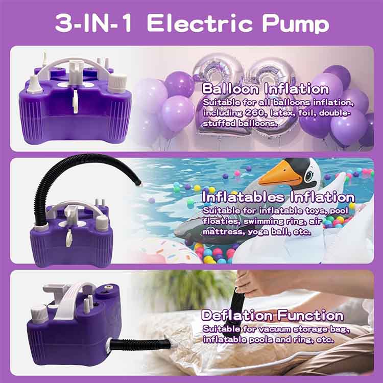3 en 1 Bomba de globo eléctrico Use tecnología para simplificar la vida y hacer que la creatividad esté al alcance. Ya sea que se trate de una reunión familiar, una celebración festiva, una aventura al aire libre o al almacenamiento en el hogar, ¡es un artefacto imprescindible para usted mejorar la calidad de su vida! ¡Consíguelo ahora y comience una nueva experiencia de inflación eficiente y conveniente!
