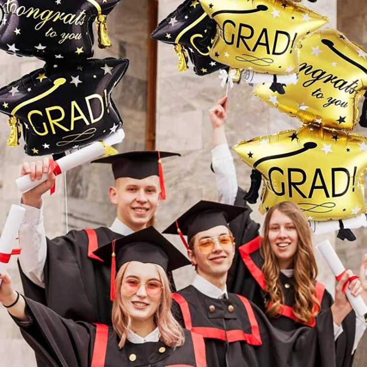 Nuestro juego de globos con gorro de graduación de 32 pulgadas está hecho de una película de PET aluminizada de alta calidad de 18 micras de espesor. Esta película tiene una elasticidad excelente, se infla completamente y esponjosa, y es resistente a la compresión y al impacto, perfecta para escuelas y lugares similares. Utilizamos tintas respetuosas con el medio ambiente para imprimir, lo que da como resultado colores vibrantes y uniformes que son resistentes a la decoloración. Incluso después de horas de exposición a la luz solar directa, como en las ceremonias de graduación al aire libre, los patrones y colores siguen siendo tan vibrantes como siempre.