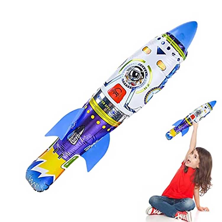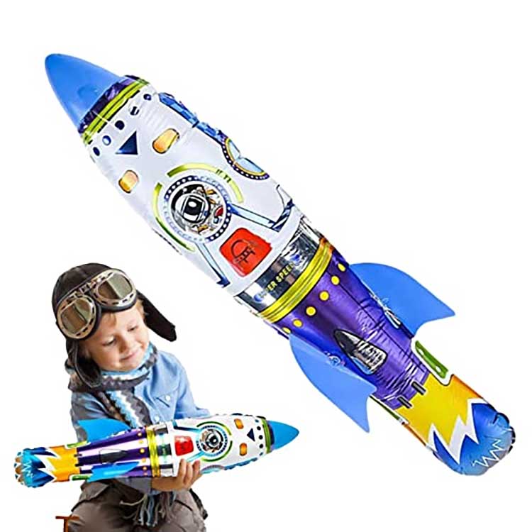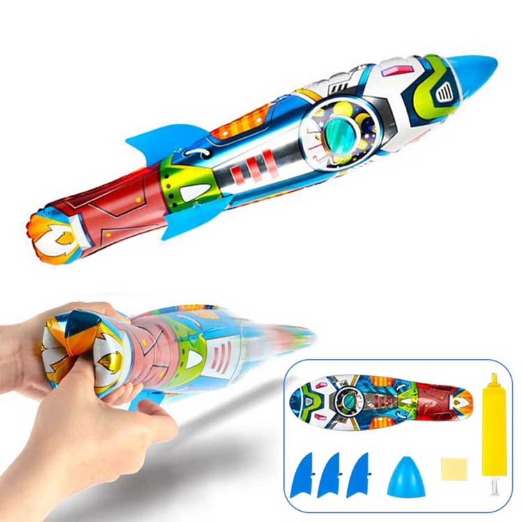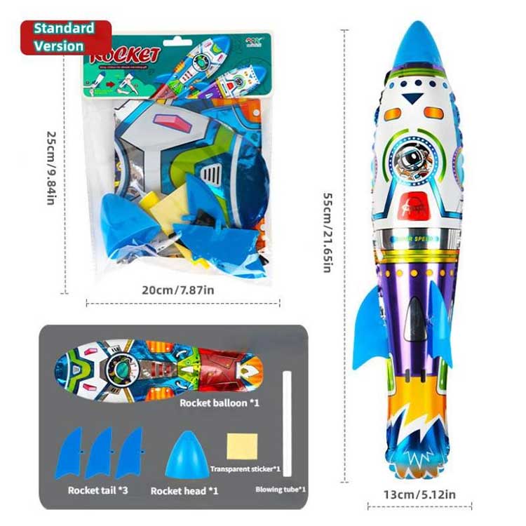 Lanzador de globos inflables con forma de cohete en 3D, también muy flexible en términos de juego; No requiere electricidad, simplemente tírela con la mano para obtener potencia de vuelo. Para hacer que el cohete vuele lejos, todo depende de qué tan alto lo sostengas y cuánta fuerza uses al lanzarlo, cuanta más fuerza y cuanto más alto lo sostengas, más lejos volará.