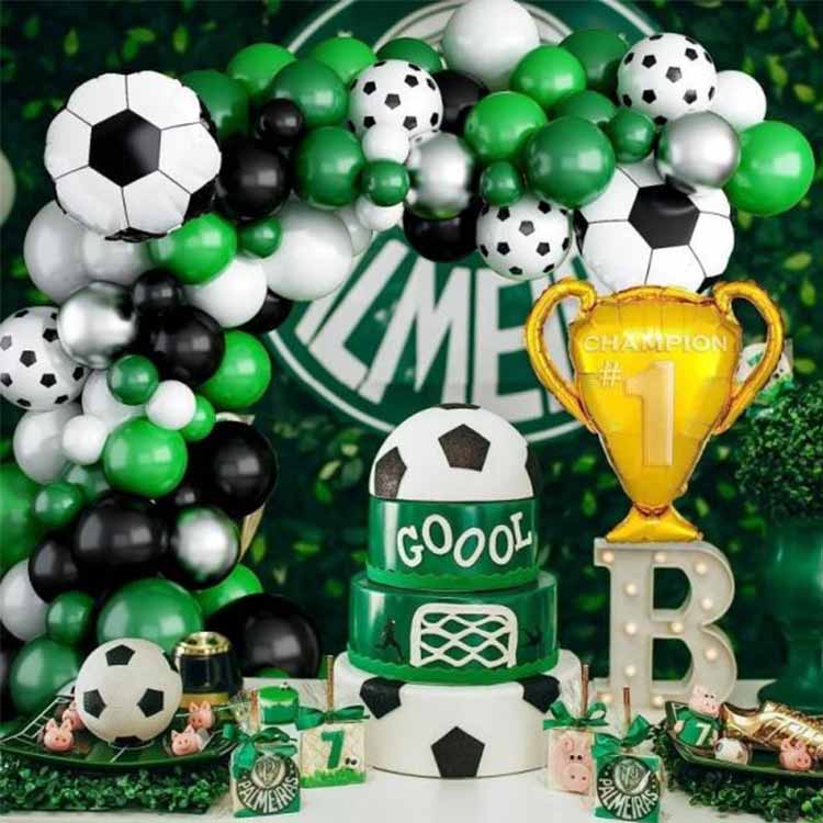 Los kits de arcos de globos con temática de fútbol constan de 101 componentes, que incluyen globos de látex, globos de aluminio y herramientas de montaje. Pueden crear un fondo decorativo en forma de arco con un diámetro de 2 a 3 metros.