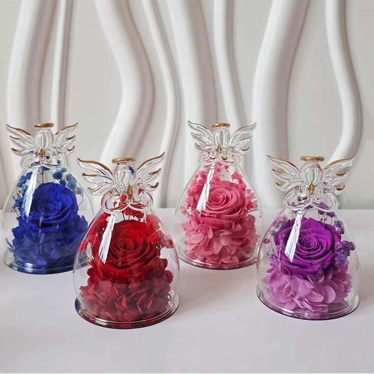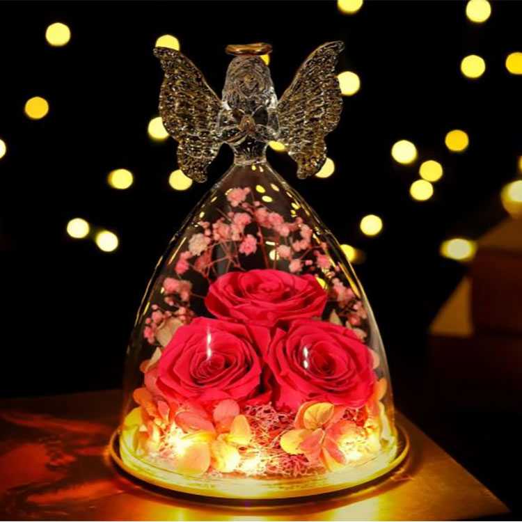 Nuestro regalo de flores preservadas con ángel de cristal admite OEM y ODM.