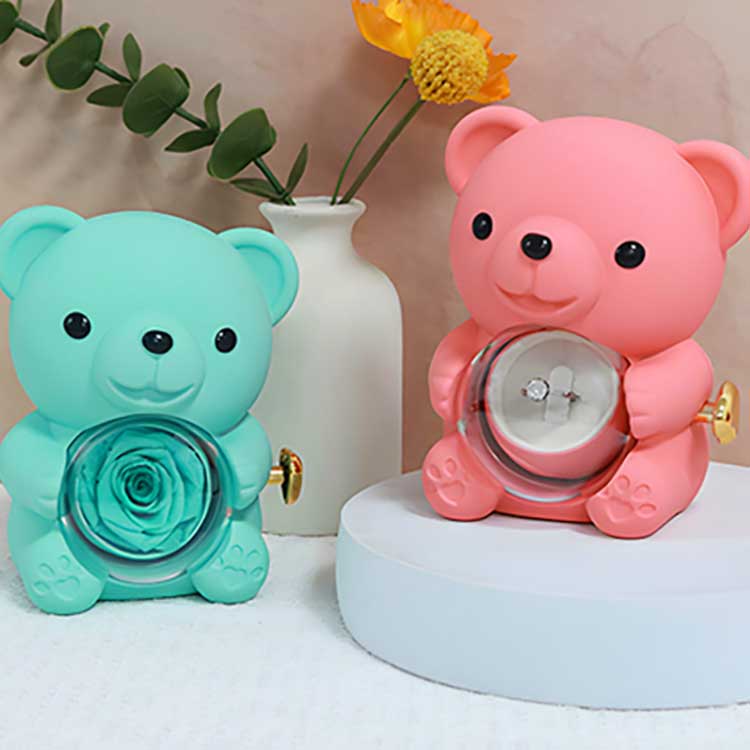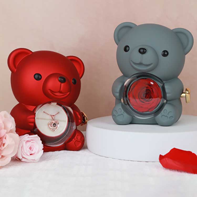 Este joyero Hug Bear Rose se utiliza para exhibirlo en un escritorio, estantería o mesita de noche. Su característica más llamativa es la rosa preservada en el centro. Al abrir la rosa se revela un compartimento para guardar joyas, anillos o recuerdos.