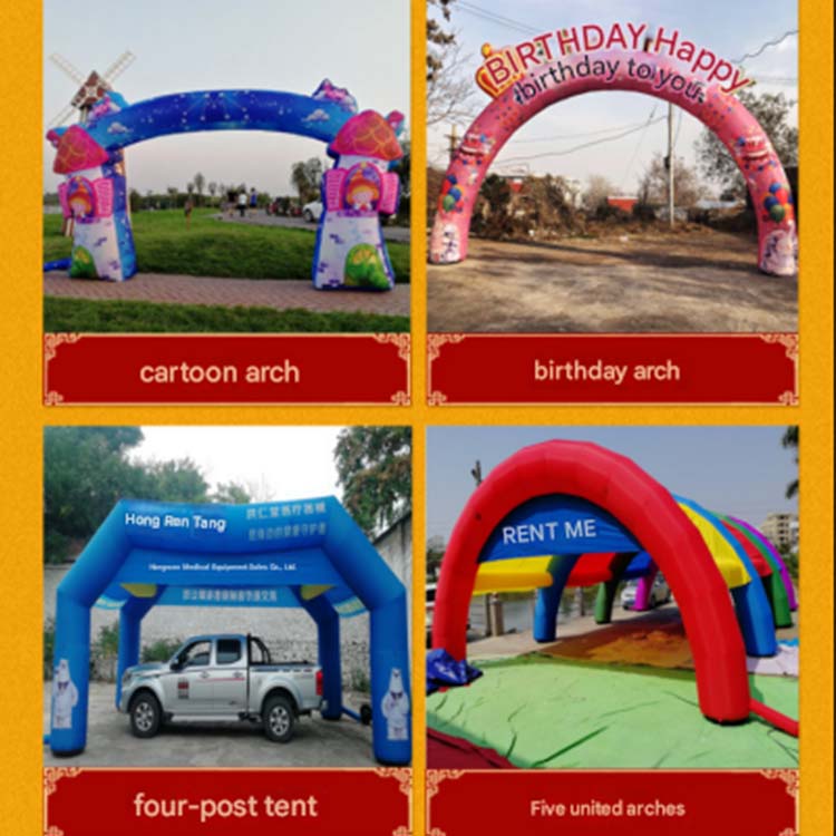 Tamaño y forma: disponible en una variedad de tamaños y diseños: arcos curvos clásicos, formas personalizadas (como logotipos, personajes de dibujos animados), arcos o estilos temáticos dobles inflables (bodas, deportes, festivales).