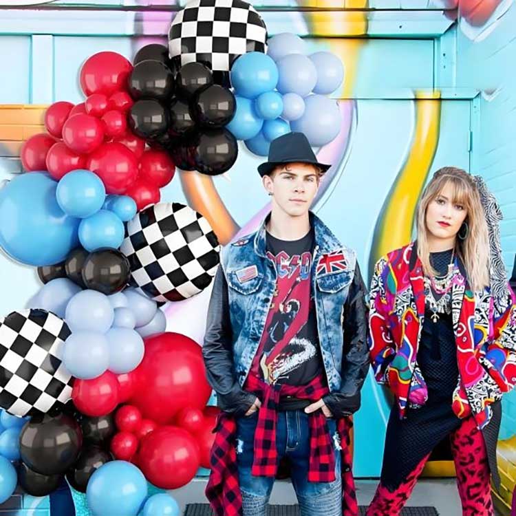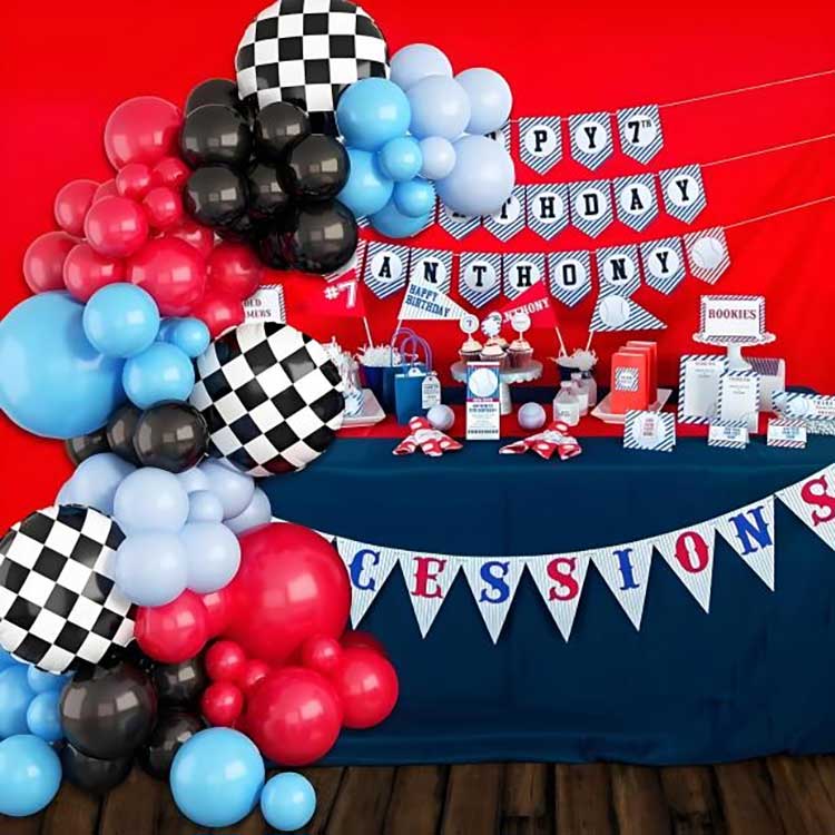 El kit de decoración del arco de globos con temática de carreras consta de 88 componentes. Incluye 80 globos de látex, 6 globos de aluminio, 1 cadena de globos y 1 punto de pegamento.