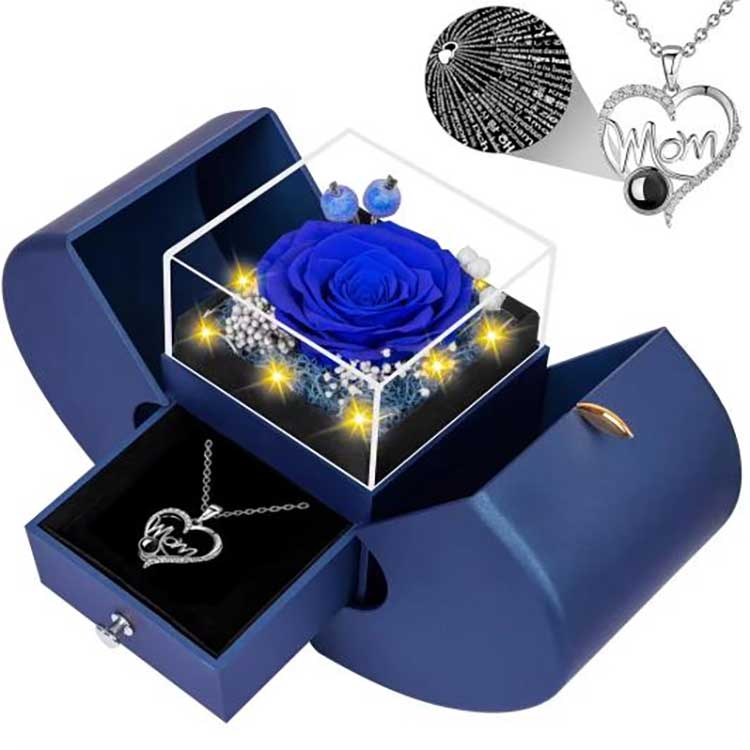 Nuestra caja de regalo de doble apertura con rosa y manzana preservadas admite personalización OEM y ODM.